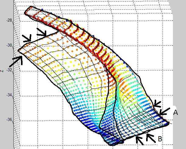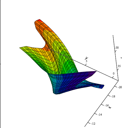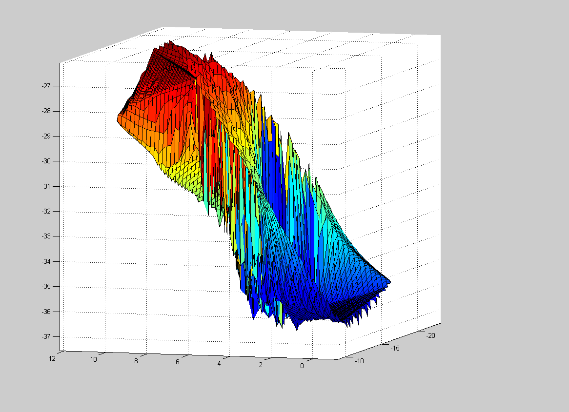 Ein Problem, das ich sehe: du hast teilweise zu einem x-y - Paar zwei z-Werte. Mit der momentanen Vorgehensweise ist das nicht möglich. Ich würde versuche, die Daten in (min.) zwei Teile aufzuspalten, so dass z wirklich als Funktion von x und y aufgefasst werden kann.