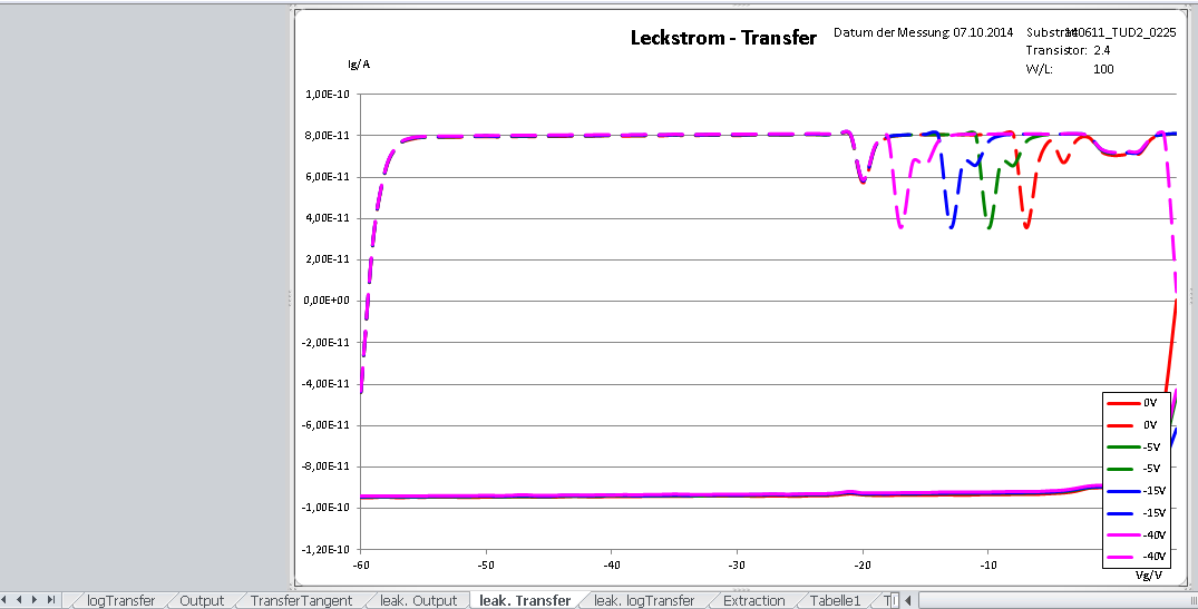 Dann wird es berechnet und ich bekomme eine Übersicht aller errechneten und gemessenen Werte von Schwellspannung, Mobility etc. Diese einzelnen Werte sind jeweils verlinkt zu der entsprechenden Kennlinie.