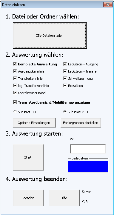 Wenn ich das Programm starte, muss ein dialogfenster kommen, in welchem ich die csv-datei auswählen kann (auch mehrere gleichzeitig) und anschließend den Ordner wählen kann, wo das Ergebnis abgespeichert werden soll. Ebenfalls kann ich über "Häkchen" auswählen, welche Kennlinien ich haben will und welche nicht.