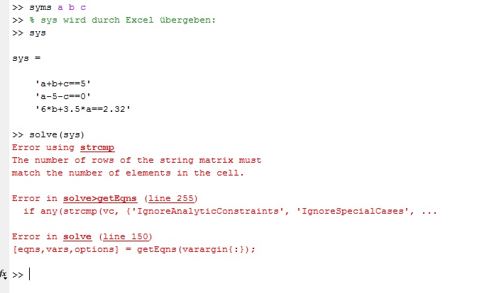 Beim ersten Bild habe ich die Gleichungen direkt in die Konsole geschrieben und die Lösung funktioniert problemlos. Beim zweiten Bild schreibe ich die Gleichung über Excel in den Workspace von Matlab. Das sind dann aber offenbar Strings mit denen Matlab nichts anfangen kann.