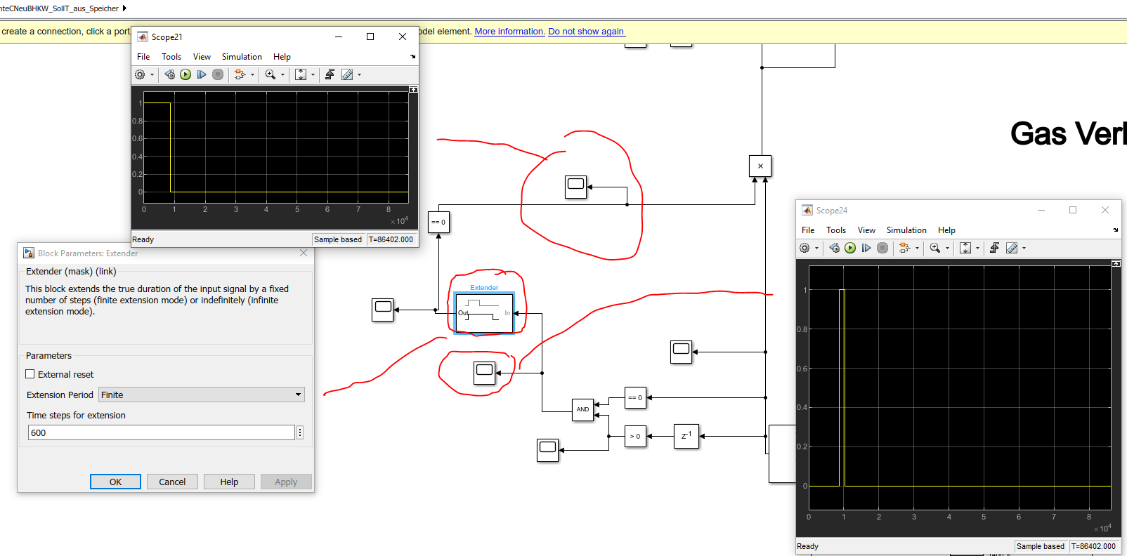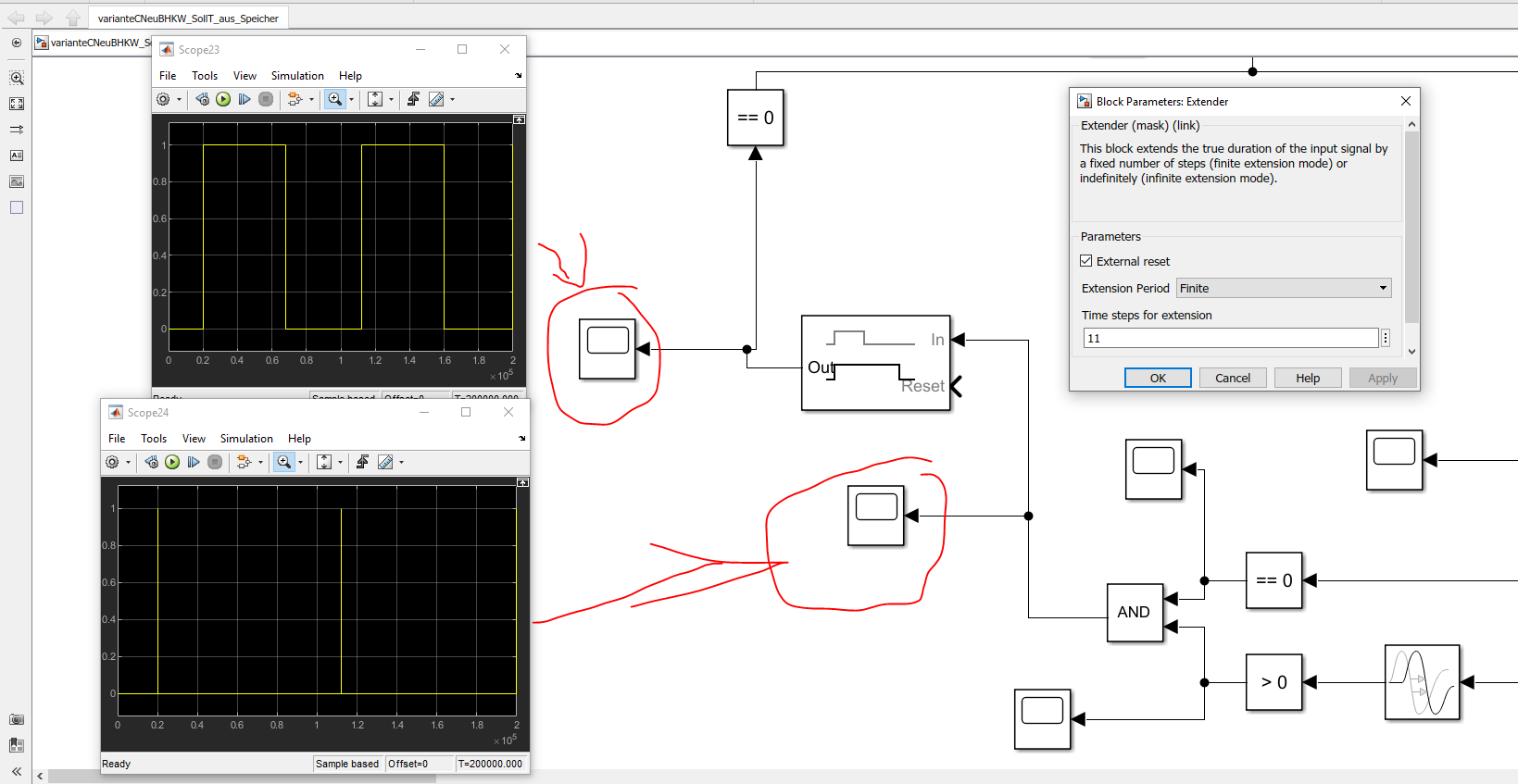ich hatte den Block Extender bei mir eingebaut. Es kommt eine 1 nach einer gewissen Zeit und die soll nicht nur eine Sekunde sondern 600 Sekunden bleiben. Dann Ausgangssignal 0 bis wieder eine 1 kommt, welche wieder 600 Sekunden verlängert werden soll.