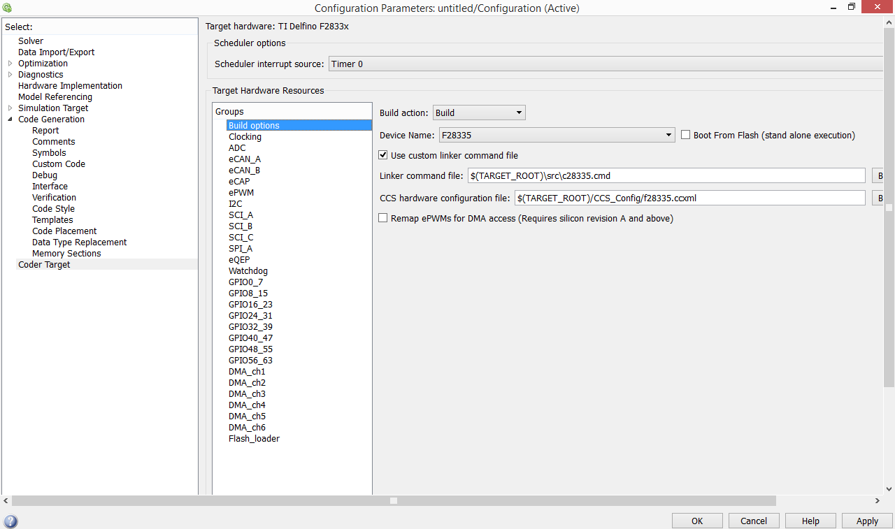 ich benutze die Texas Instruments F28335 ControlCARD mit CCS v5. Ich habe soweit in Matlab alles eingestellt, damit die Codegenerierung funktioniert. Einfache Beispiele wie variable PWM-Ausgabe über ein Poti funktionieren.