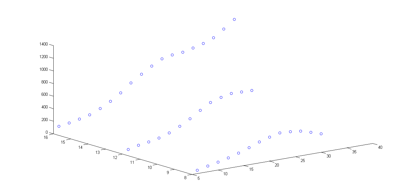 Jetzt habe ich die Datenpunkte schonmal 3D plotten können. Nun möchte ich aber auch die fehlenden Punkte zwischen den Versuchsreihen extrapolieren bzw. eine Oberfläche durch alle Punkte legen!