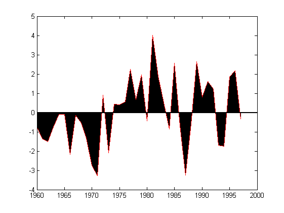 Ich stelle das Beispiel kurz vor, ich habe Daten über die ich den Mittelwert bilde und die jeweiligen Abweichungen von diesem Mittelwert bilde. Darstellen möchte ich die Abweichungen von diesem lokalen Mittelwert (der hier also der Wert 0 ist). Mit einem plot Befehl lässt sich der Graph der Abweichungen ohne weiteres natürlich darstellen. Zusätzlich habe ich noch einen Linienplot eingefügt, für die "Nullline".