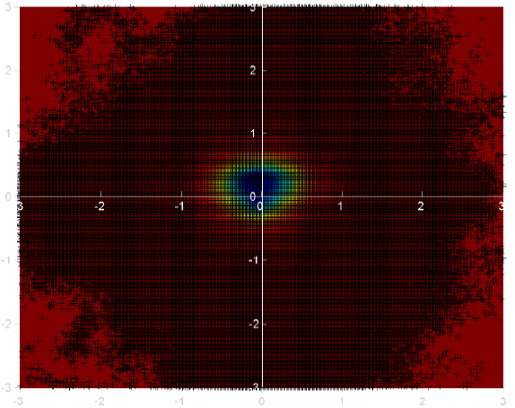 Es wird nun beides geplottet.(Siehe Anhang) Die Punkte (+) der Wertepaare. Die Dichteverteilung mit "Jet"-Skala liegt jedoch immer noch dahinter. Diese wird jedoch durch das flipud umgekehrt (blau= hohe Dichte anstatt rot)