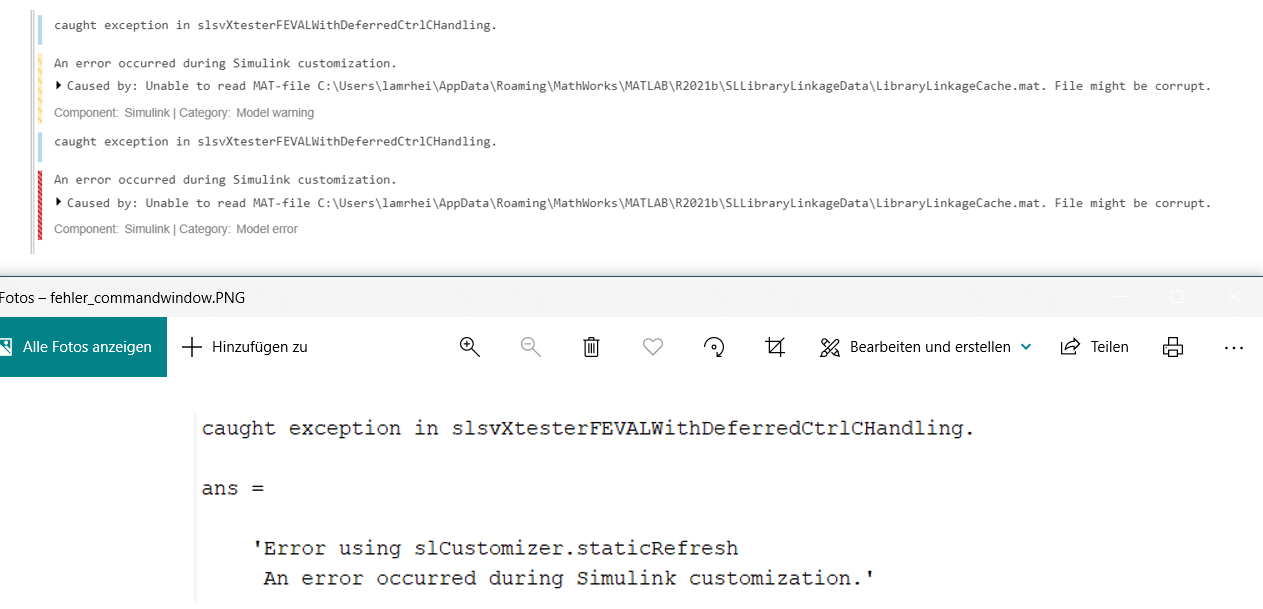 On your machine, please go to the MATLAB "prefdir" and then navigate into a directory called "SLLibraryLinkageData". This directory should contain a MAT file named "LibraryLinkageCache.mat". Please delete this file and restart MATLAB. ", kann aber nichts damit anfangen, bzw. verstehe nicht in welchem Ordner was gemacht werden soll