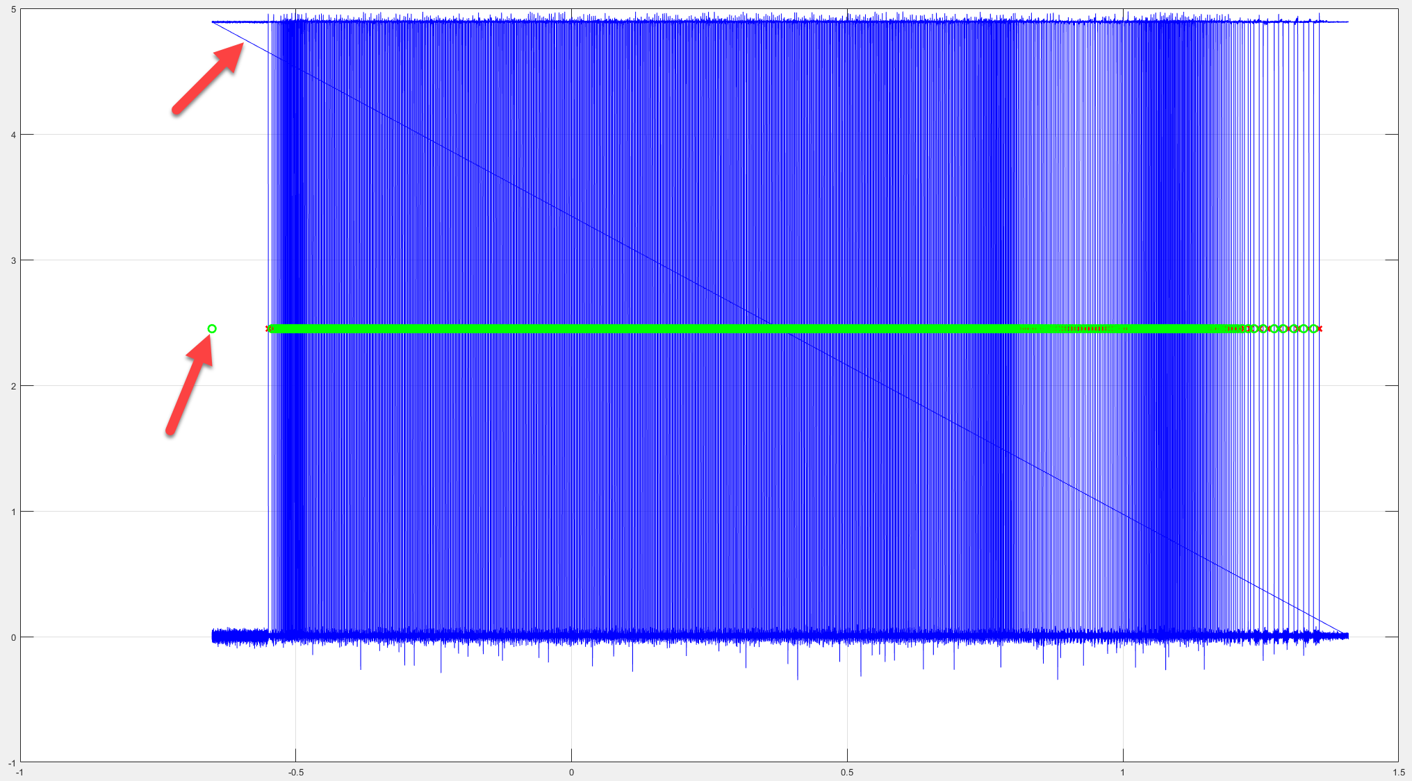 % Show the falling edges with green o's. plot(t_ex_All(Neg_AllHalls), threshold_OfAll, 'MarkerSize',8,'Marker','o', ...