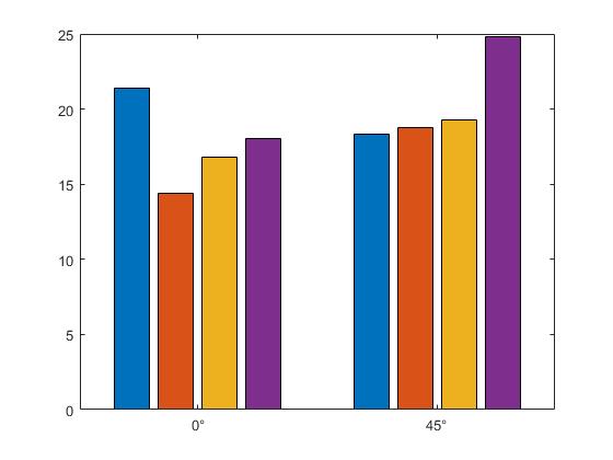Jeweils 4 Balken sollen zu einem Winkel gehören. Die Fehlerbalken sollen zu jedem Balken gehören. Ich bekomme leider den Fahler, dass die Argumente von errorbar die gleiche Länge haben müssen. Wie kann ich das umgehen?
