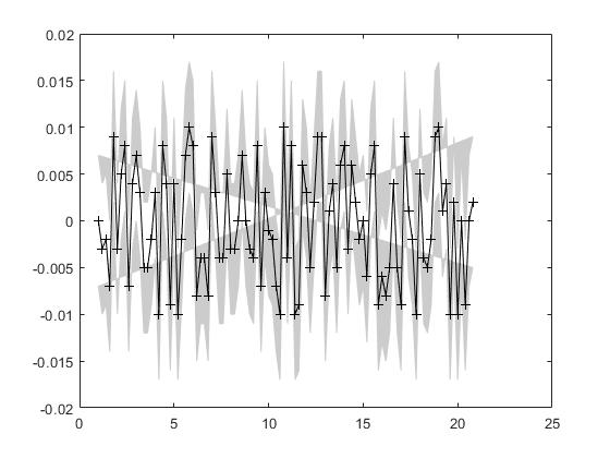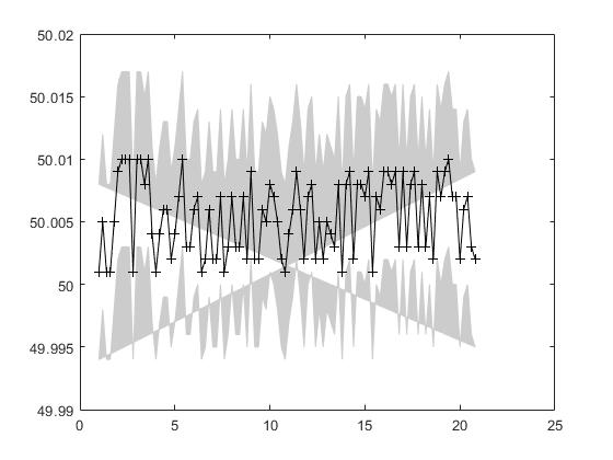 ich habe einen Datensatz und möchte den Fehlerbereich (der Werte auf der y-Achse) als farbigen Bereich darstellen. Hierfür habe ich die Daten geplottet und wollte mit area, fill oder patch den Bereich zwischen den zwei Funktionen (Daten + bzw. - Fehlerbereich) füllen. Hierbei treten verschiedene Probleme auf.