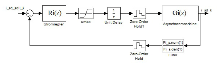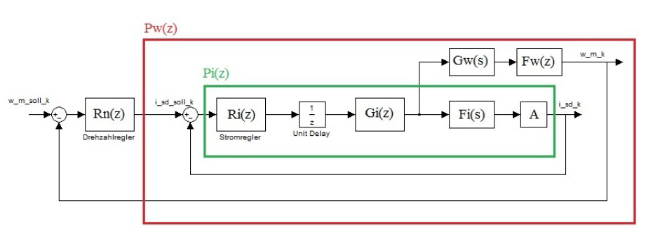 Hab dir mal die Strukturen für Strom- und Drehzahlregelkreis in den Anhang getan. Achtung, das sind irgendwelche für den zeitdiskreten Fall (nicht explizit für dein Problem). Beim Stromregelkreis ist ein PWR mit ( ) und ein Stromfilter eingebaut. und ein Drehzahlfilter. Bei den Bildern hab ich mich vielleicht vertan, alle Ü-fkt. sind im s-Bereich, außer natürlich die Regler.