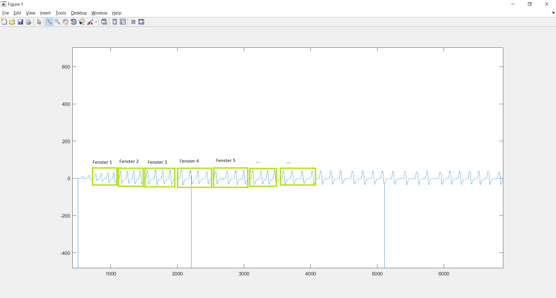Für die weitere Datenverarbeitung (FFT, PSD, etc.) brauche ich eine Fensterung dieses Signals, sodass in jedes Fenster 4 Flow-Spitzen hineinfallen (siehe Anhang).