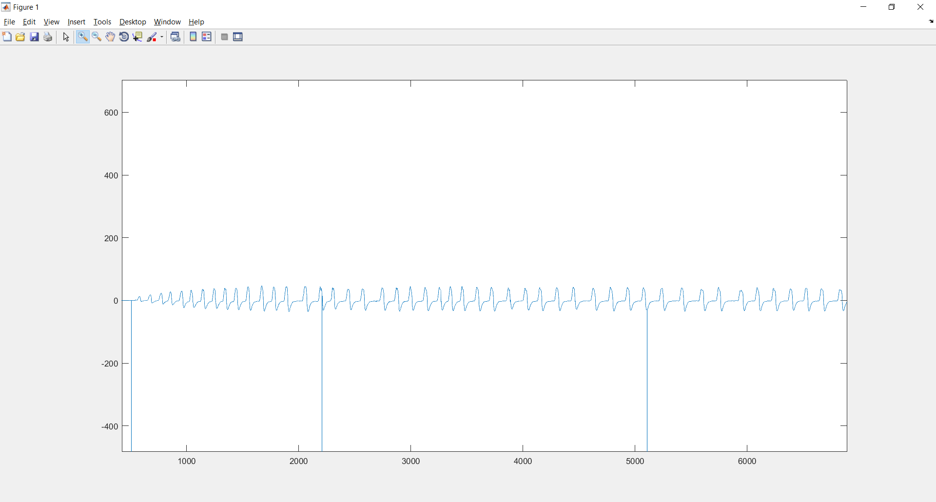 Ich erfasse ein Flow-Signal (siehe Anhang, x-Achse Zeit, y-Achse Flow). Man sieht sogar in diesem kurzen Ausschnitt (das gesamte Signal hat zw 600 und 1000 Peaks), dass die Frequenz ständig leicht variiert.