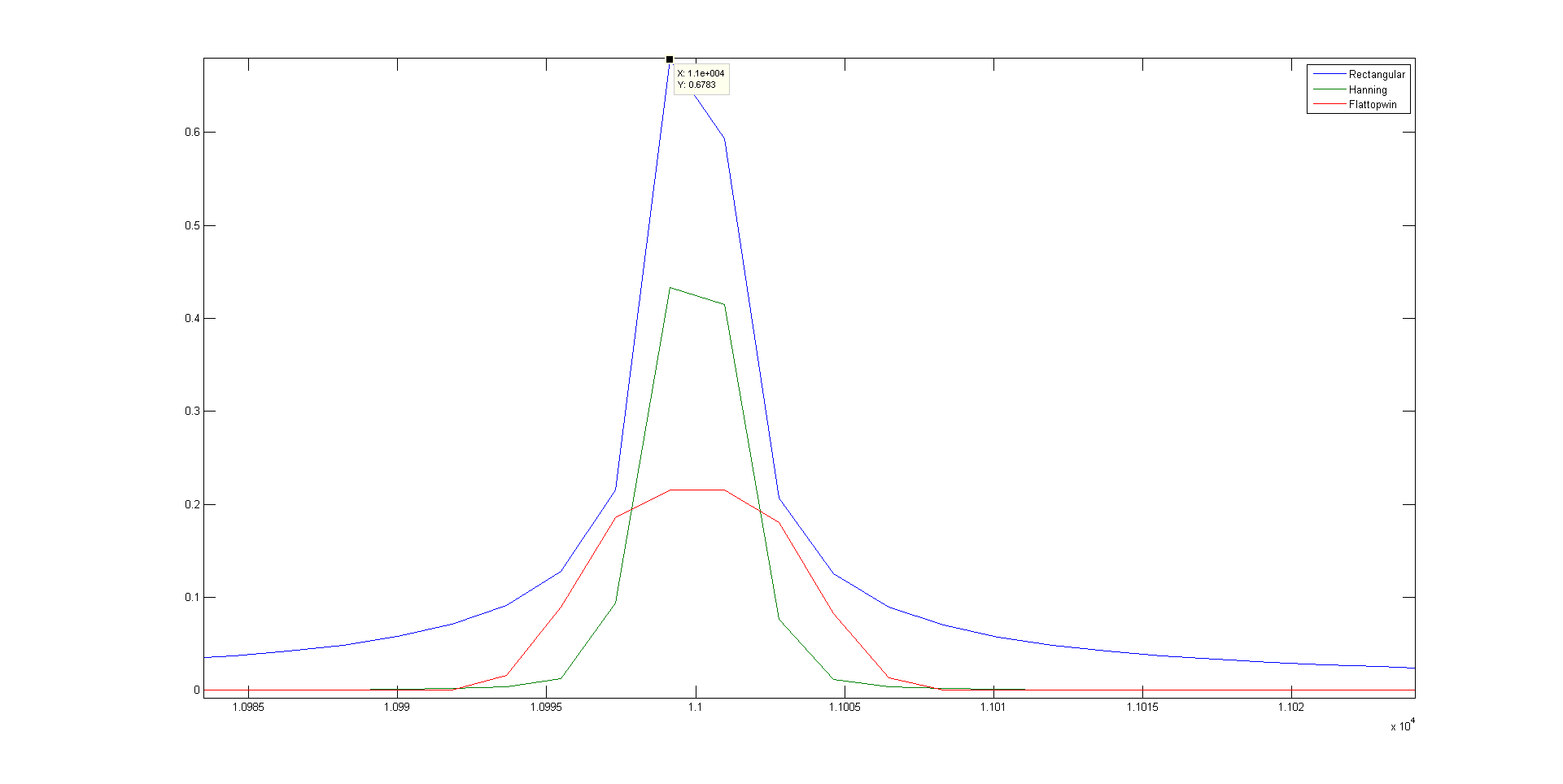 Auch versuche ich die Auswirkung der Wahl des Fensters (rectangular, hanning, flattopwin) festzustellen.