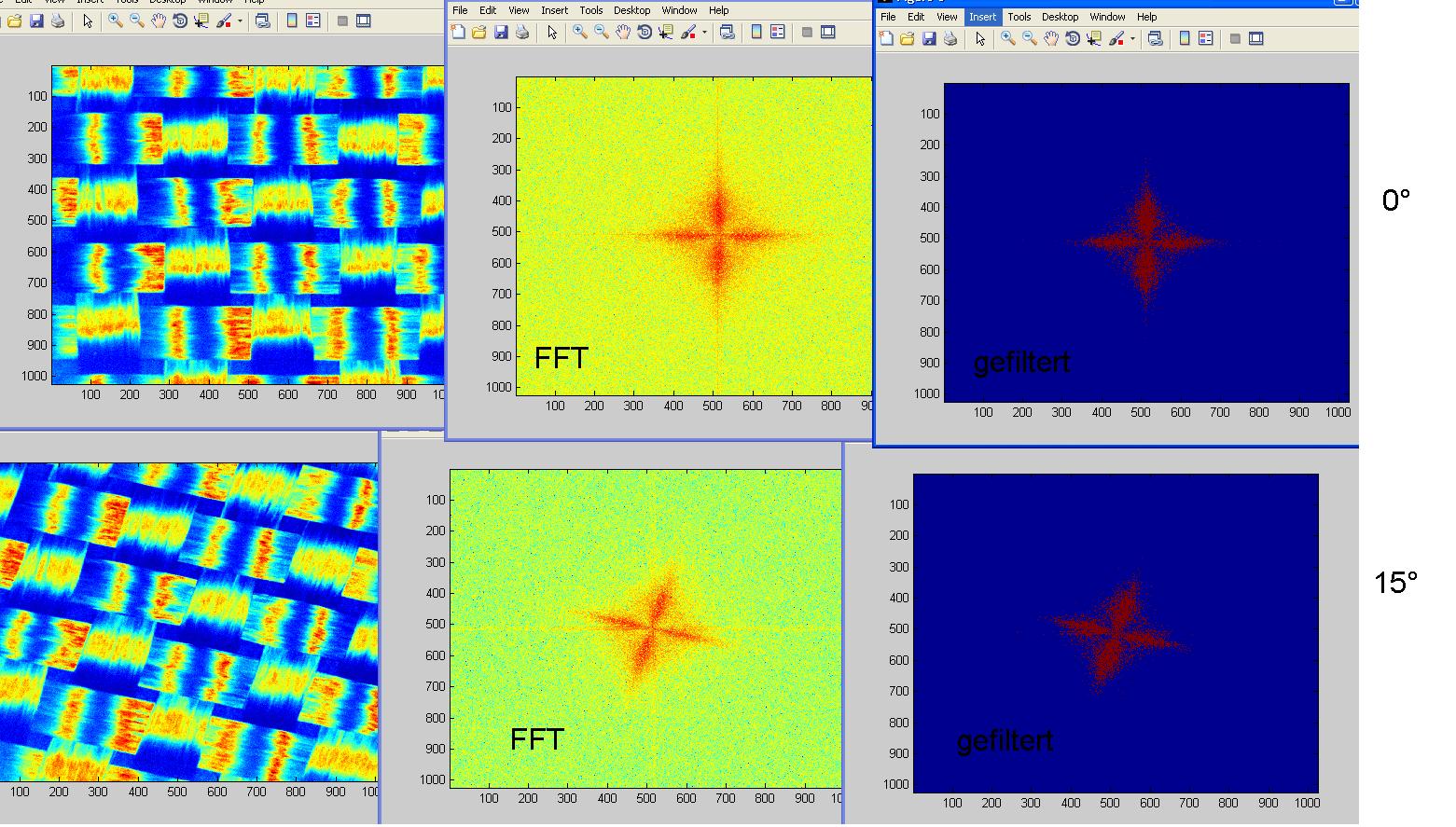 Dieses Bild wird mit einer FFT zerlegt und anschließend gefiltert, ich möchte nun mit diesen Daten zum Beispiel den Eigenvektoren über "princomp" diesen Winkel zu einer Achse berechnen.