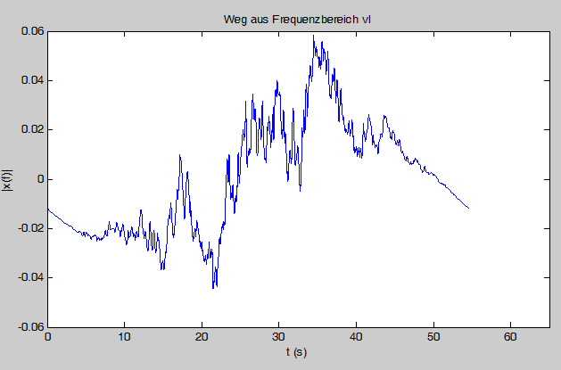 Wenn ich das ganze mit Messdaten mache kommen lediglich noch Filter hinzu, die zum einen die Rohdaten einmal filtern und nach jeder nummerischen Integration filtern um die offsets rauszurechnen (untere Frequenz 0.5Hz). Das Ergebnis aus dem Zeitbereich sieht auch brauchbar aus. Das aus dem Frequenzbereich schwingt nichtmal um Null?!