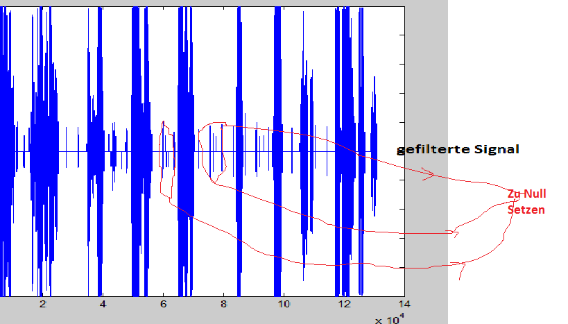 Du hast Dein Problem nicht genau beschrieben. Ich find Dein Bild zwar sehr orginell. Aber es wird nicht klar, wie an dem Signal, das weggeschnitten werden soll, mathematisch definiert ist: hohe Frequenz, niedrige Amplitude, länge der Abschnitte?!