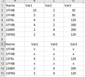 Es soll mir alle Namen mit 1FF4B raussuchen und anschließend in die jeweiligen Spalten Var1 Var2 Var 3 die Werte ersetzen, die ich in meinem Skript definiert habe.