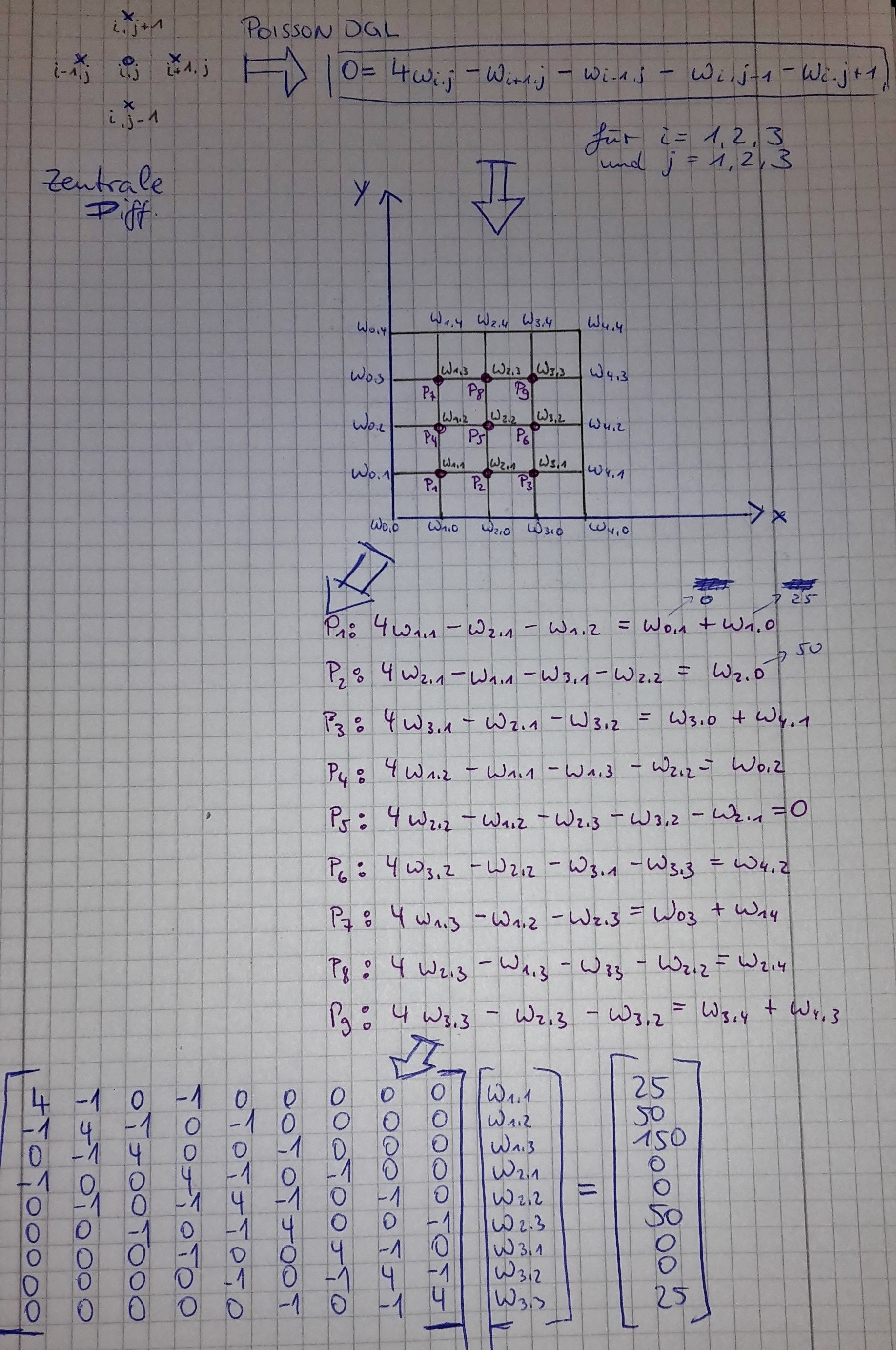 Ich habe hier ein einfaches Beispiel einer Diskretisierung auf Papier geschmiert. Die partielle Differentialgleichung 2.Ordnung (Poisson) habe ich in Differenzen (zentrale Differenz) umgeschrieben und habe das LGS aufgestellt. Eigentlich ganz easy. NUR, will ich nun das LGS in Matlab "automatisiert" erstellen lassen. Das heißt: ich muss nun irgendwie mit der obersten Formel und for-schleifen (schätze mal, da 2 Laufzeitvariablen = 2 verschachtelte for-schleifen??) diese 9x9 Matrix hinbekommen. Ich weiß, dass ich das von Hand eingeben könnte, aber ich möchte später andere Gitter verwenden können, ohne groß "umstellen" zu müssen.