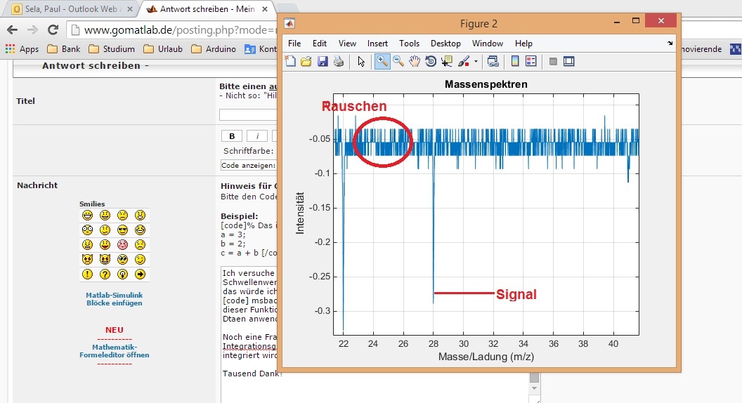 Also, ich habe ein Massenspektrum als xls-Datei aufgenommen (s. Abbildung Massenspektrum) und möchte bei diesem die Fläche unter einzelnen Peaks berechnen. Die Peaks sind nicht immer gleich daher würde ich die Integrationsgrenzen gern beliebig anpassen können. Ich würde auch gern ein Variable festlegen mit der ich den Hintergrund abziehen kann, der also ein Höhe vorgibt.