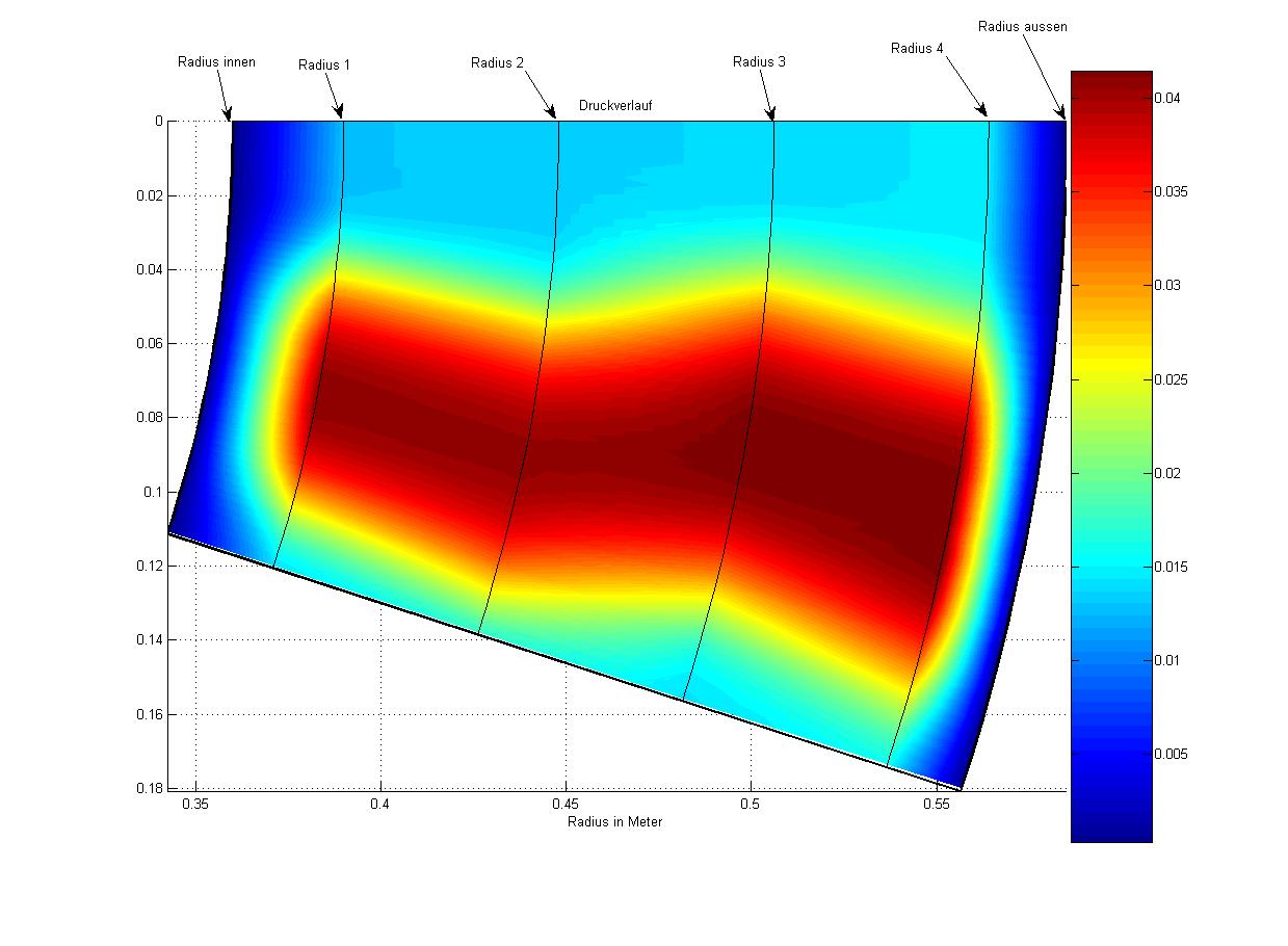 title('Druckverlauf');xlabel('Radius in Meter');zlabel('Druck in bar');