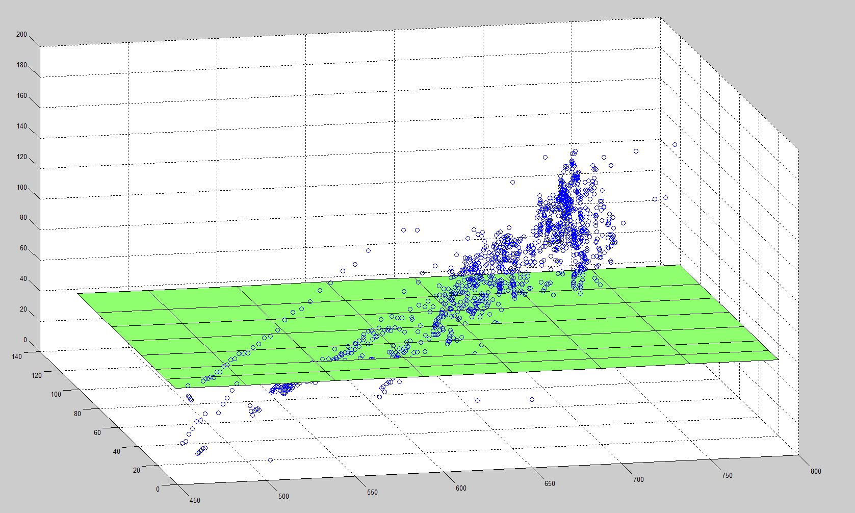 Die Aufgabe ist nun in diese Punktewolke eine Fläche zu legen, die möglichst gut in der Mitte der Punktewolke liegt. Wichtig ist, dass die Fläche nicht eben sein muss.