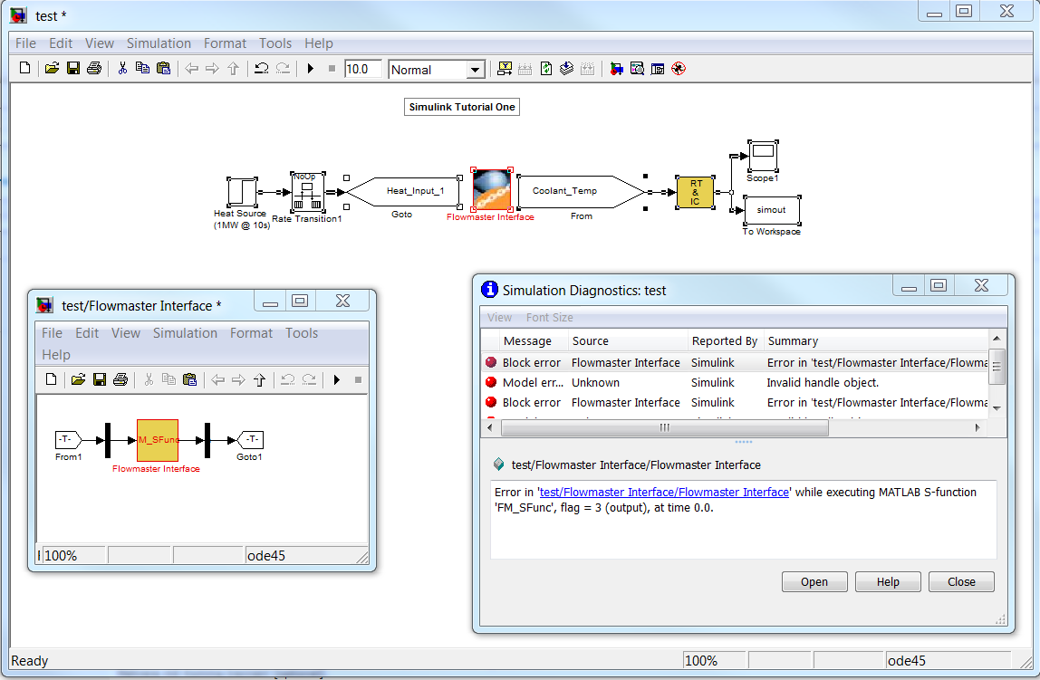 | Error in 'test/Flowmaster Interface/Flowmaster Interface' while executing MATLAB S-function 'FM_SFunc', flag = 3 (output), at time 0.0. |