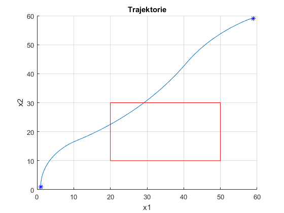 Mein aktuelles Ergebnis meiner Optimierung ergibt die blaue Linie auf dem Bild. Und ich möchte nun, dass diese Linie nicht durch den roten Kasten durchfahren darf. Darum möchte ich den Kasten als Nebenbedingung in die Optimierungsberechnung mit reinnehmen.