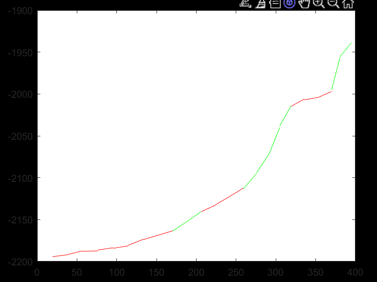 Anschliessend habe ich über jeweils 3 Punkte Ausgleichsgeraden gelegt. Diese geben mir die Steigung an. Da der gegebene Grenzwert bei 30° liegt, habe ich die einzelnen Geraden jeweils rot und grün geplottet.
