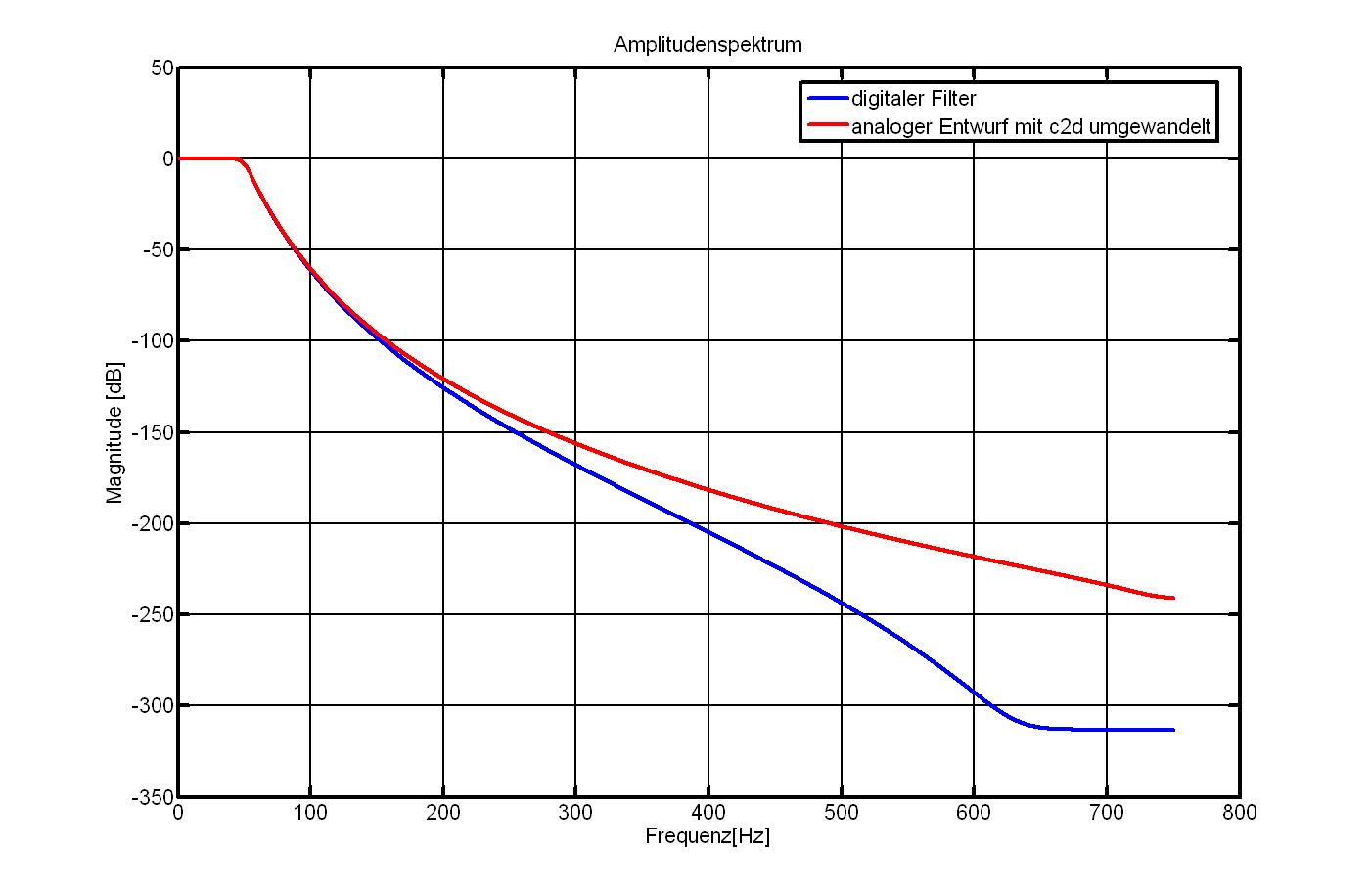 Ich habe dir mal noch das analoge Filter diskretisiert und dann beide Versionen mit freqz dargestellt. Wie du siehst, ist der Unterschied minimal. Auch die Koeffizienten unterscheiden sich nur unwesentlich. Die Umwandlung mittels c2d hat dabei auch schon einen Einlfuss, warum sie nicht exakt gleich sein. So bin ich vorgegangen...