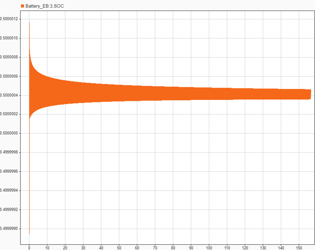 Es ist so, dass die Batterie erstmal nur geladen werden soll und nicht entladen. Beim Kanal SOC (State of Charge) sieht man aber, dass die Batterie sinusförmig be- und entladen wird - so wie der Eingang. Ich vermute also, dass hier der Gleichrichter noch nicht so funktioniert.