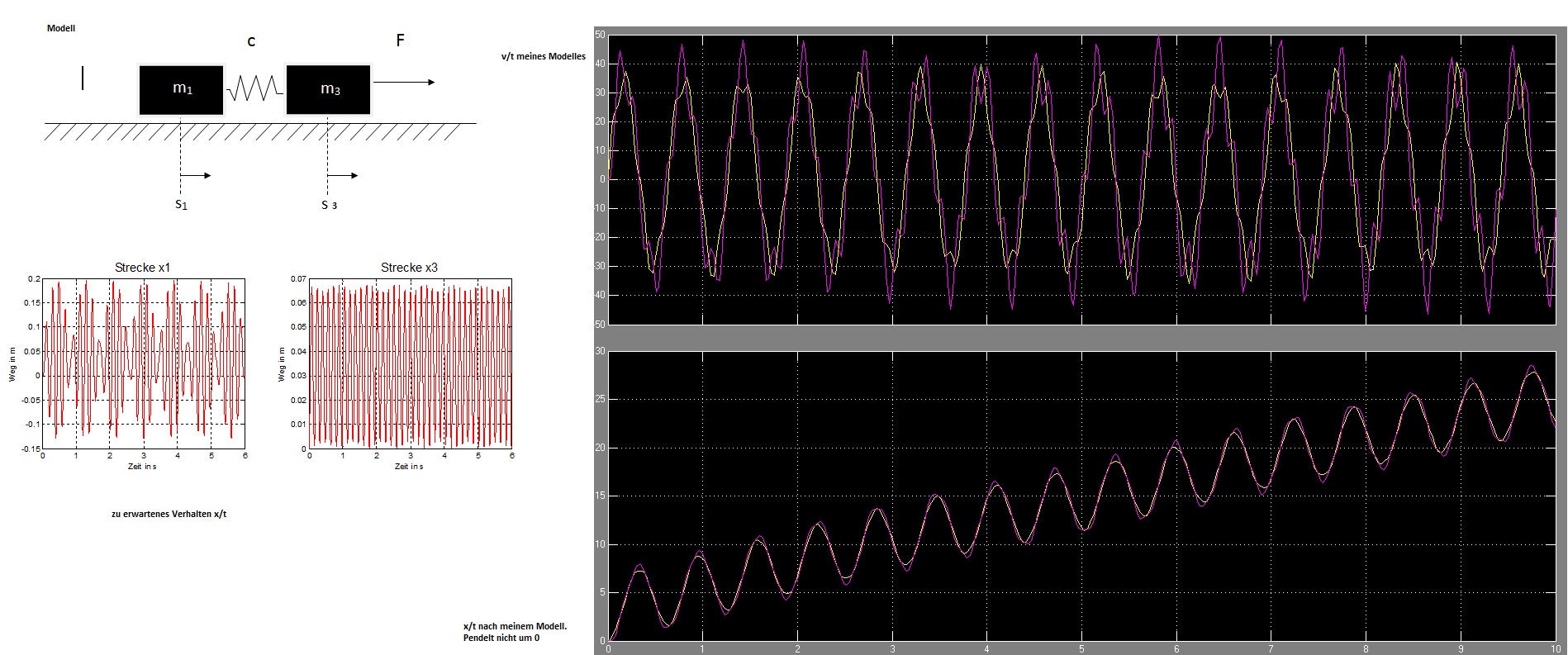 (Bild des Systems im Anhang) Zu 70% passiert auch was ich erwartet habe, die a/t v/t Diagramme entsprechen meinen Erwartungen (Vorrausgesetzt meine Erwartungen sind richtig) nur das x/t Diagramm springt aus der Reihe. Ich denke es liegt am letzten Integrierer, sicher bin ich mir aber nicht. Eigentlich muesste die Strecke auch um den Nullpunkt Pendeln, da die Kraft (F*cos(w*t)) cosinus-förmig an m2 angreift.