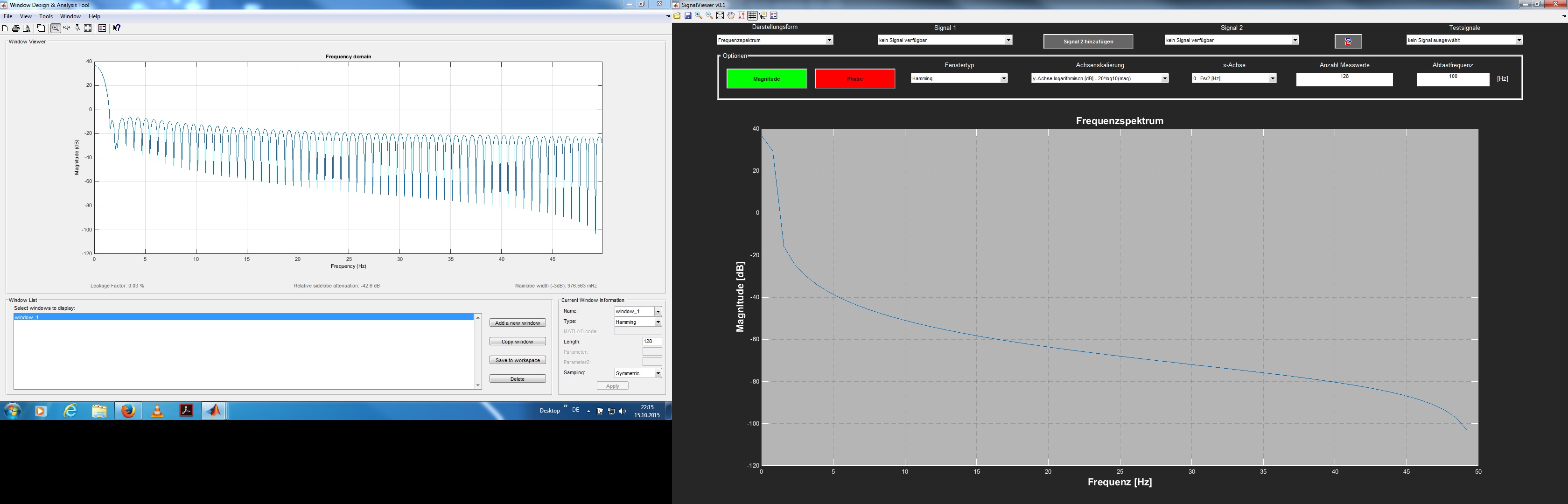 Die Zeitfunktionen sind identisch. Allerdings stimmt mein eigenes Frequenzspektrum eines Hamming Windows nicht mit der Darstellung im Wintool überein. Siehe Bild: links Wintool, rechts mein Viewer.