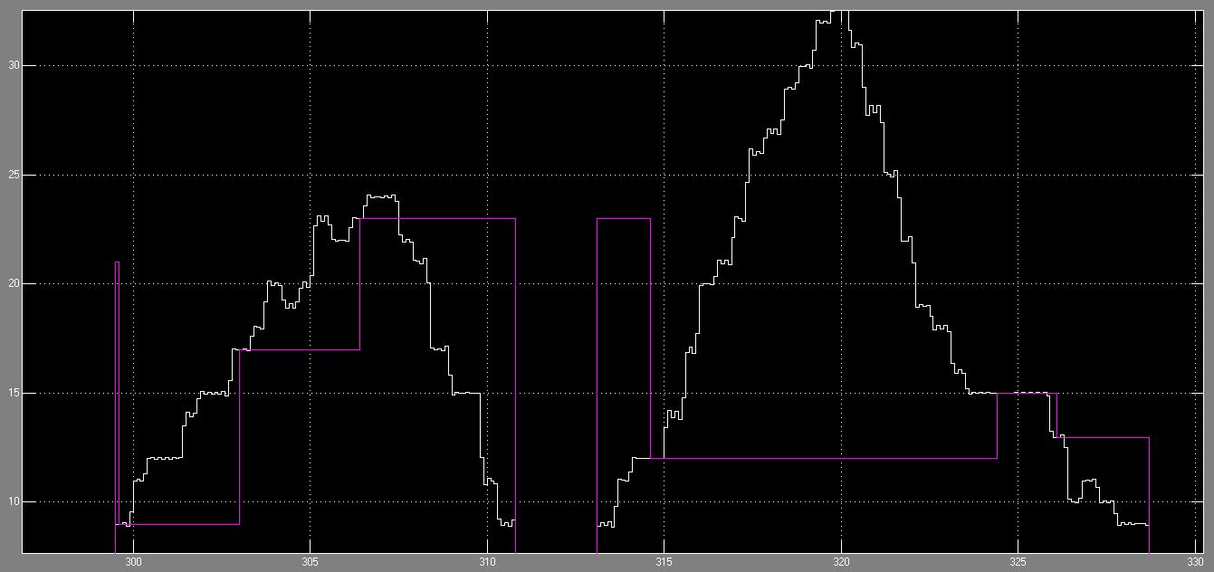 Eine andere Lösung fällt mir jetzt auf die schnelle nicht ein. Besonders bei höhen Sprüngen (z.B. Bereich 223 - 233) ist es schwer, den kalkulierten Sollwert dazu zu bringen, über die gesamte Länge oben zu halten, da er dann wohl in mindestens einer Stufe ansteigen wird.