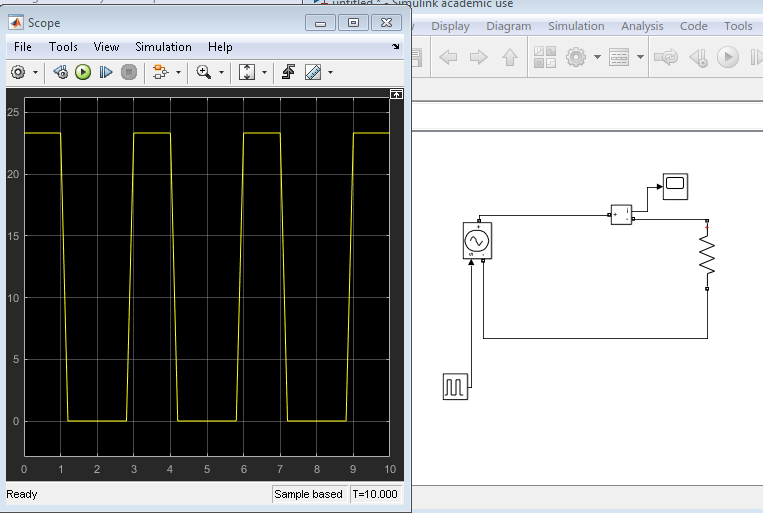 ich habe eine ganz simple Frage. Ich baue mir in Simulink eine einfache elektronische Schaltung zusammen. Dabei kommt auch ein Pulsgenerator zum Einsatz, der eine Spannungsquelle ein- und ausschaltet. Wenn ich den Pulsgenerator auf dem scope anschaue, ist er genau rechteckig. Messe ich dagegen den Strom, wird das Rechteck abgewinkelt. Auch bei anderen Spannungen und Zeitskalen ist die Auflösung sehr grob.