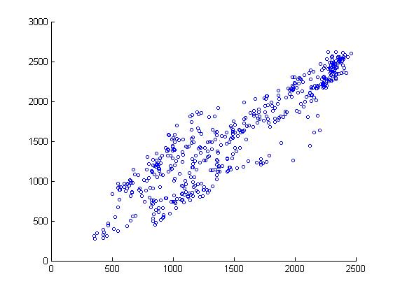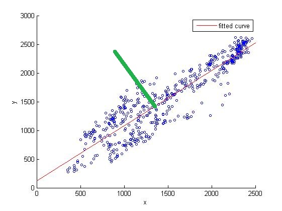 zu fitten (lineare Regression) und das Ergebnis mittels "hold on" mit in den Scatterplot zu zeichnen:
