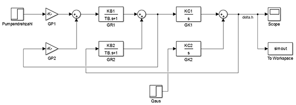 Ich habe in Simulink ein Blockschaltbild erstellt (siehe Bild) und würde gerne wissen, ob es möglich ist, sich die Übertragungsfunktion für die gesamte Regelstrecke ausgeben zu lassen in der Form 1/(T²*s²+2*D*T*s+1)? Also mit der Pumpendrehzahl als Eingang und delta.h als Ausgang. Ich weiß, dass die Funktion sich in der Form darstellen lässt, doch T u. D sind mir unbekannt.