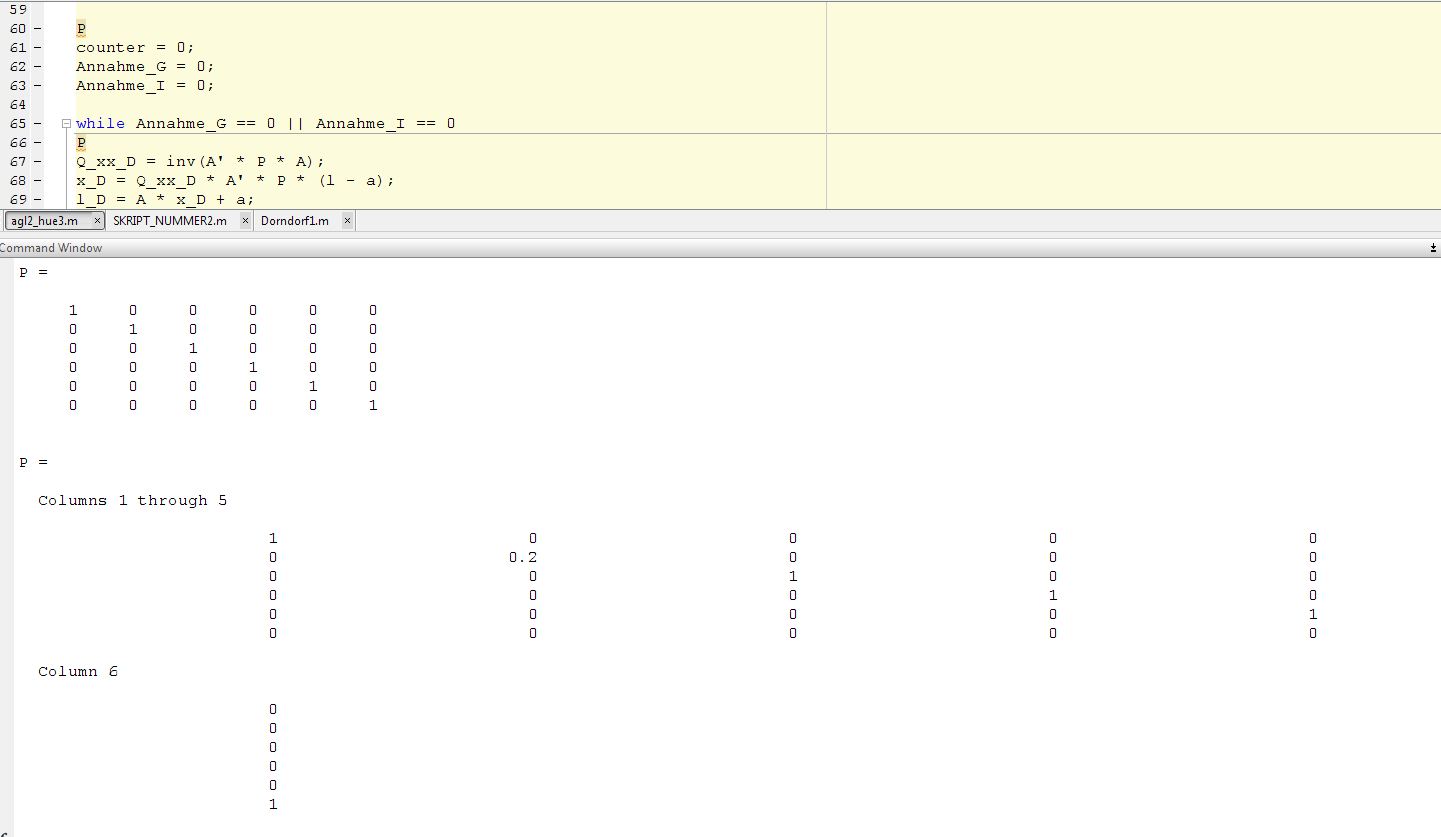 Auf dem Bild sieht man oben den Quellcode, in dem in den Zeilen 60 und 66 die Matrix P ausgegeben werden soll. In den Zeilen dazwischen passiert nichts mit der Matrix. Unten auf dem Bild ist die Ausgabe zu sehen, wo jetzt auf einmal das Element (2,2) "0.2" statt "1" beträgt. Kennt jemand diesen Fehler und/oder weiß wie das zu beheben ist?
