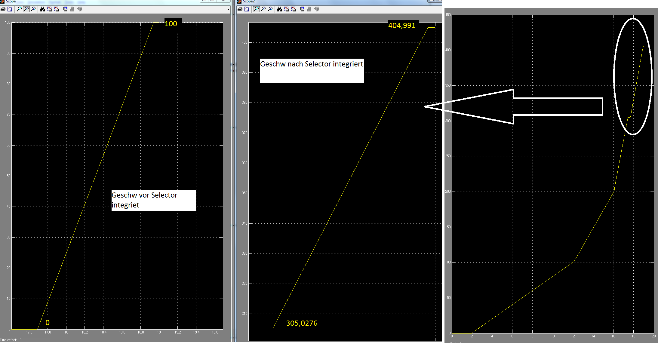 Wird allerdings nach dem Selektor die Geschwindigkeit zu der aktuellen Position der Flasche (305,0276) integriert, komme ich nur bis 404,9918 statt 405,0276.