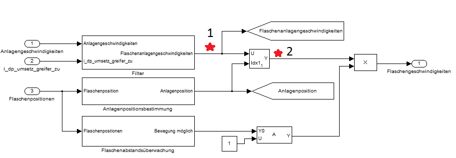 Am Punkt 1 der Anlage befindet sich der Vektor der Geschwindigkeiten der einzelnen Anlagenteile. Integriere ich dort die mich interessierende Geschwindigkeit erhalte ich die Position, die von 0 bis 100 geht (siehe linkes Scope).