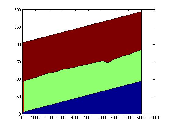 Ich hatte mir eine Matrix konstruiert, welche in der ersten Spalte die Koordinaten der y-Achse, in Spalte 2 die x-Koordinaten für die linke und in der 3. Spalte die x-Koordinaten für die rechte Linie enthält. Das Ergebnis habe ich dir unten angehängt.