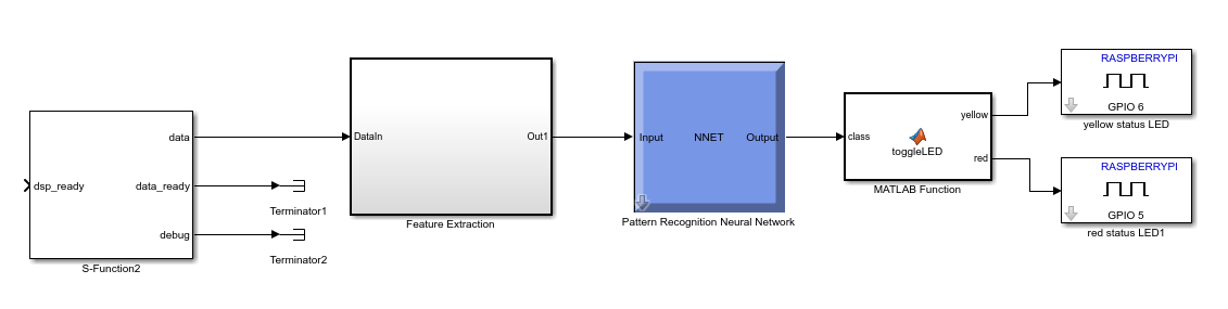 Ich nehme Messwerte über ein Raspberry Pi 3 auf und verarbeite diese in Echtzeit auf dem Rpi. Dazu habe ich in Simulink ein Modell erstellt, das eingehende Daten verarbeitet und über ein Pattern Recognition Neural Network (ANN) aus der Neural Network Toolbox 10.0 klassifiziert. Meine sample time beträgt in etwa 0,5s, sodass mir das ANN alle 0.5s einen Vektor ausgibt. Die Vektorlänge entspricht meiner Anzahl an Klassen.