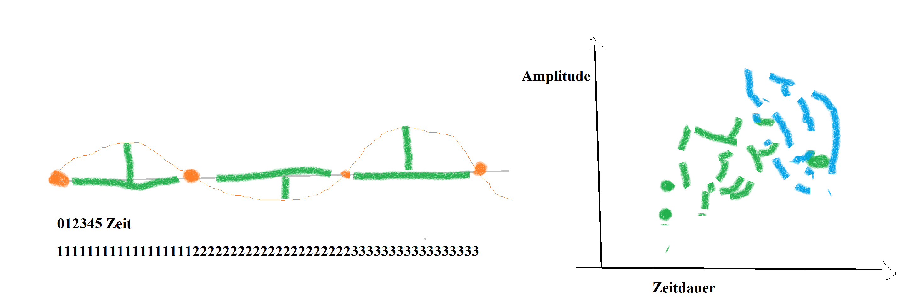 Ein Diagramm, dass die Amplitude (X-Achse) und Zeitdauer zwischen den VZW (Y-Achse) in Abhängigkeit darstellt. Dabei soll eine Punktewolke entstehen.