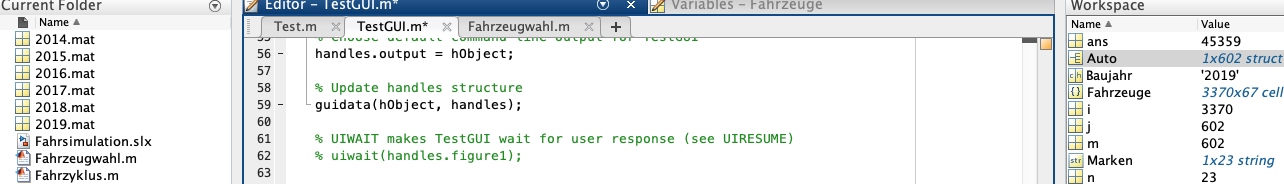 Und zwar muss ich in GUI eine Liste (POPUPMENUE) erstelll, um auszusuchen welches Baujahr auserwählet werden soll und in der 2019.mat Datei sind dieAutos mit Marken, und Models .