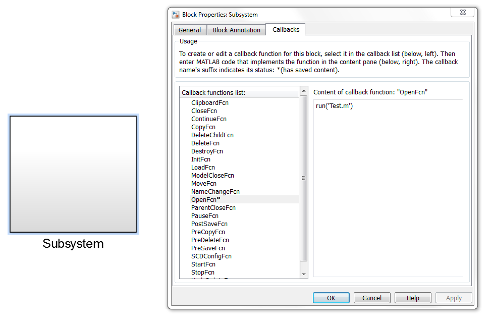 Ich möchte nicht die Benutzeroberfläche eines Subsystems anpassen, sondern die eines komplett neu erstellten Blockes der mit MATLAB-Code geschrieben ist. Bisher konnte ich keine Syntax finden, um direkt im Quelltext Einfluss auf die Benutzeroberfläche nehmen zu können!?