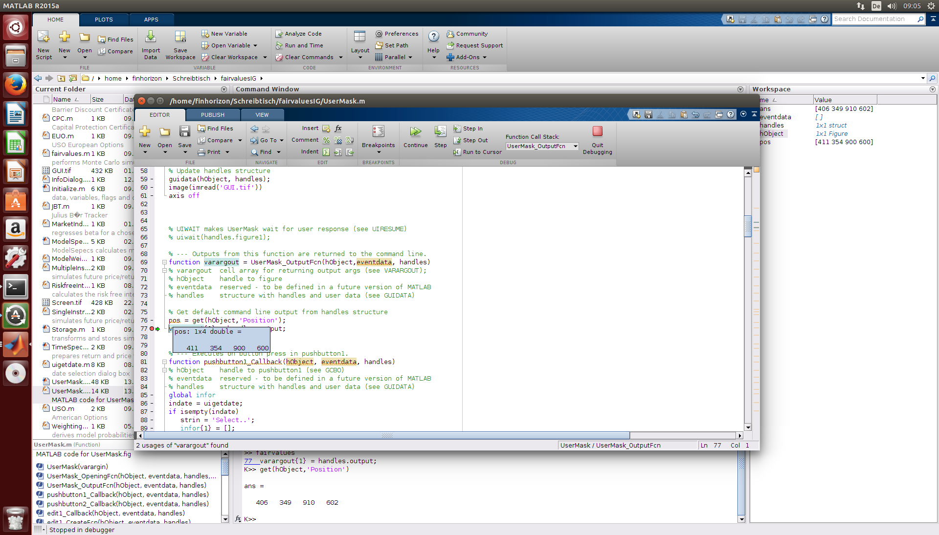 Wenn ich allerdings die Position über das hObject in der OpeningFCN über die Funktion 'get' abfrage, gibt er mir die richtige Grösse wieder obwohl er im Debug Modus eine Andere anzeigt. Ich habe zum Verständnis ein Screenshot angehängt. Er zeigt im Debug-Modus den Wert der Abgfrage von 'get'. Ganz unten sieht man zum gleichen Zeitpunkt der Wert der Abfrage wenn ich es über das command-Window mache.