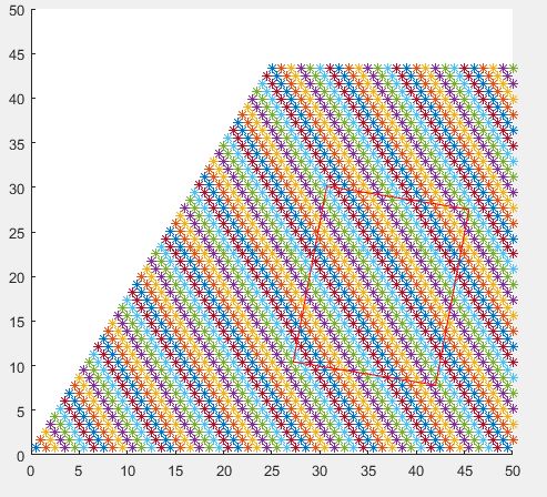 Ich möchte eine Funktion schreiben, die auf einer rechteckigen Fläche (Eingabeparameter Kantenlängen: x,y) eine Anzahl von Punkten (Eingabeparameter Anzahl: 6<n<200) in einem Hexagonalem Muster (so wie auf dem Bild) plottet.