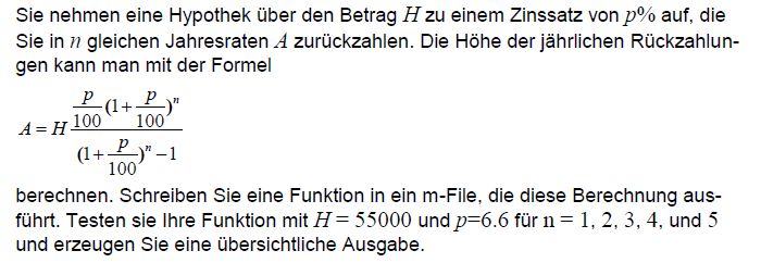 Mit A*n kannst du dann noch berechnen, welchen Gesamtbetrag man über die jeweilige Laufzeit bezahlt. Dieser ist natürlich grösser als H und nimmt mit der Laufzeit zu. Bei n=1 ist A = H*(1+p/100) = 55000*1.066.
