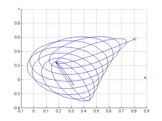 vP = vP + cntT.*vV; % der neue Aufenthaltsort wird auch immer neu berrechnet plot(vP(1), vP(2), 'mo'), hold on % Plotten des Aufenthaltspunktes von dem Planeten
