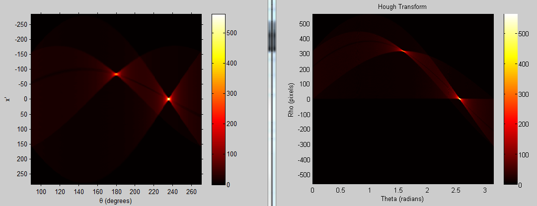 Mittlerweile bin ich dank dieses Beispiels, das die Hough-Transformation anders implementiert als die MATLAB-eigene Funktion soweit gekommen, dass ich darstellungstechnisch zwei sehr ähnliche Diagramme plotten konnte.