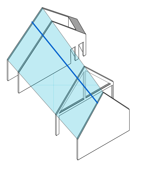 Dadurch dass sich das Gebäude verjüngt, die Trauf- und Firsthöhe allerdings gleich bleibt, ergibt sich (so hoffe ich habe ich inzwischen rausgefunden) ein hyperbolisches Paraboloid. Da ich eine Mittelpfette als Auflager brauche (dicke blaue Linie) muss ich nun die Gerade berechnen, die sich durch meine Fläche zieht.